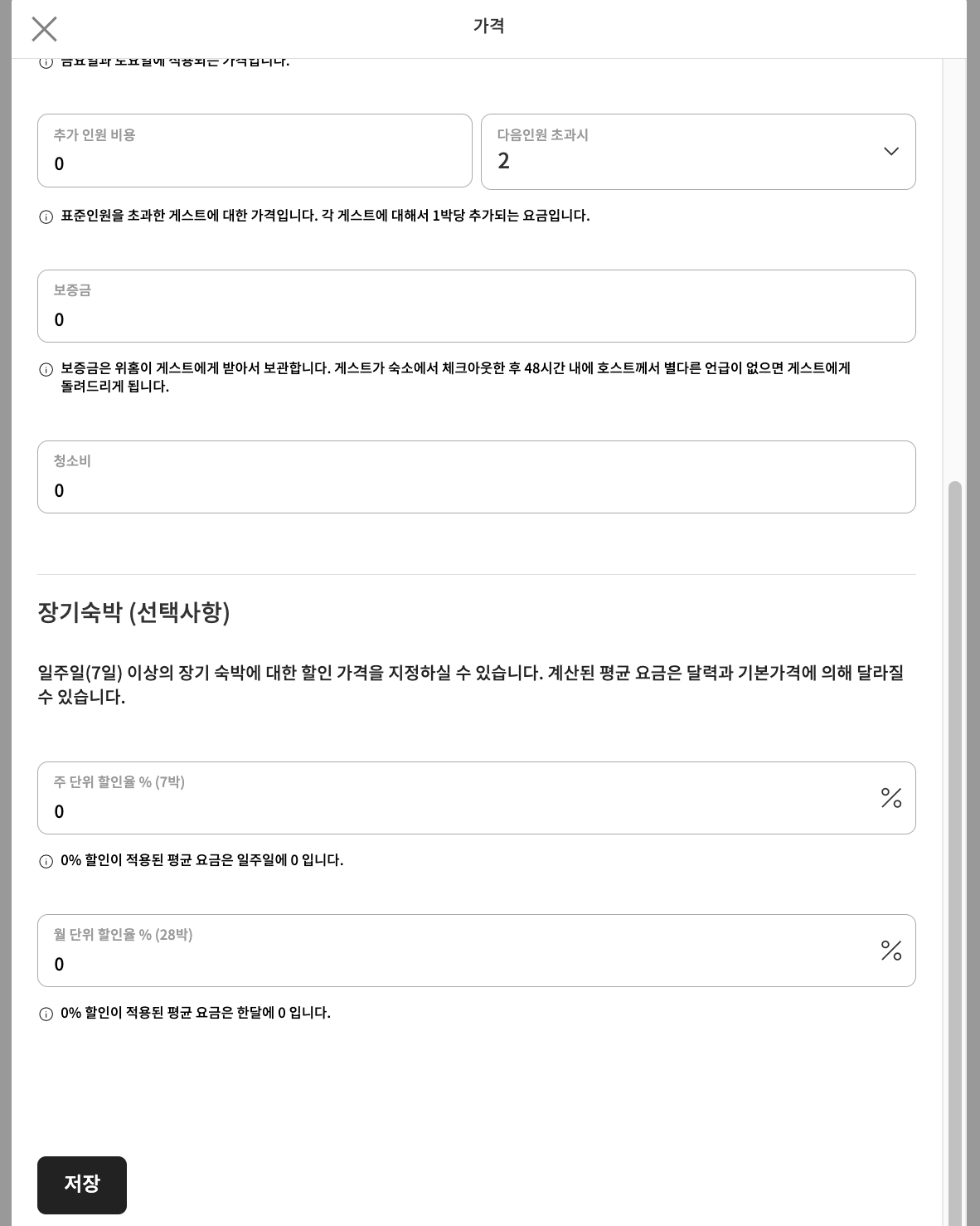 2. 숙소 정보 관리 화면을 하단으로 이동해 [가격]을 선택하고 가격 화면에서 장기숙박 할인률을 입력하면 됩니다. 입력 후 [저장]을 선택해주세요.