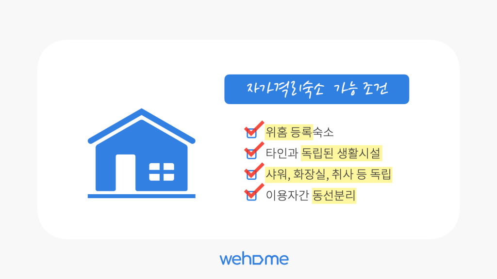 A5. 도시민박업/외도민업에 등록되어 계시거나 살고 계신 집에서 공유숙박을 원하시는 분으로 서울과 경기지역의 지하철1호선~9호선에서 1Km내에 위치해 계시면 위홈공유숙박업 등록이 가능합니다. 게스트가 다른 사람과 동선이 겹치지 않고 독립생활이 가능한 숙소 또는 독채는 합법 자가격리 숙소로 운영하실 수 있습니다.