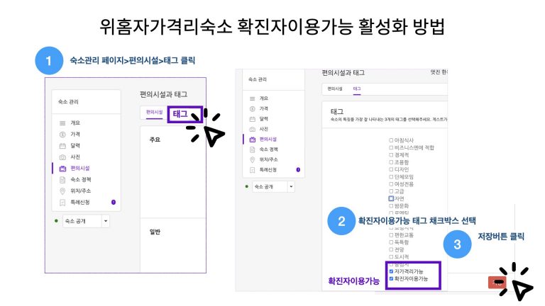 코로나 위기 상황에서 위홈 호스트님들께서 사회적 자가격리숙소 부족 문제를 해결해 왔습니다. 최근 경증확진자가 증가하고 있습니다. 정부와 자치구에서 운영하던 사회격리시설 대부분이 없는 상황에서 확진자 숙소 부족 문제가 큽니다. 이번에도 호스트님들의 참여를 부탁드립니다. 자가격리 및 확진자 이용숙소 태크 지정 방법을 알려드립니다. 정책에 관련해 자세한 사항은 다음안내 내용 아래를 참고하시기 바랍니다.