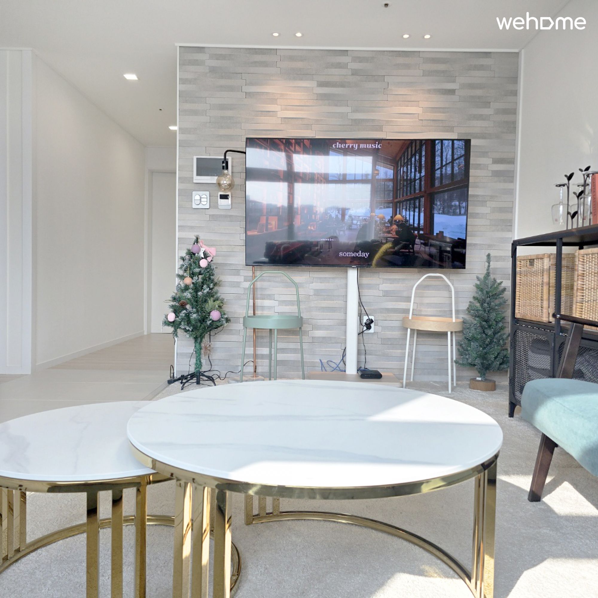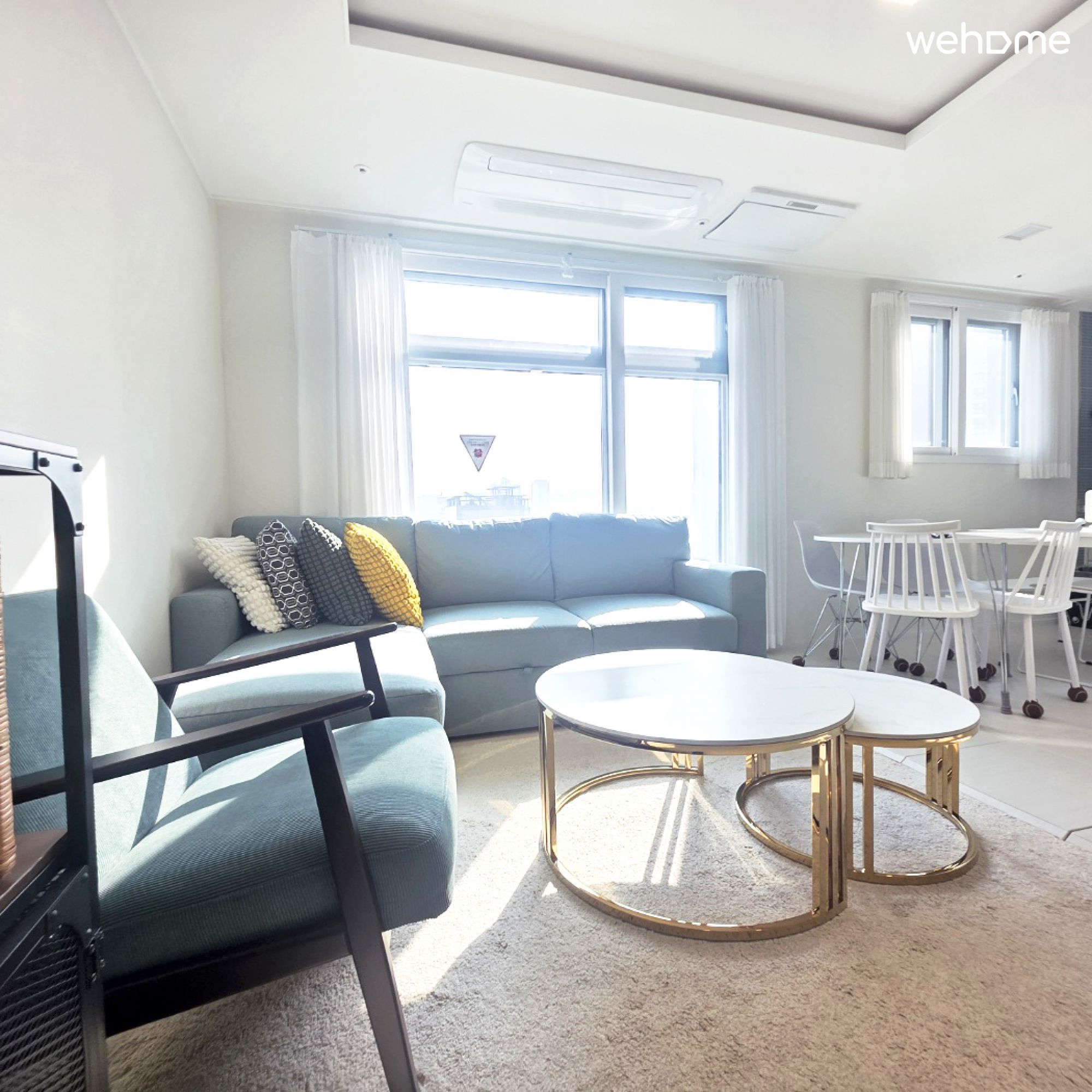 沙发床、扶手椅、65 英寸电视、空调、地毯、毯子