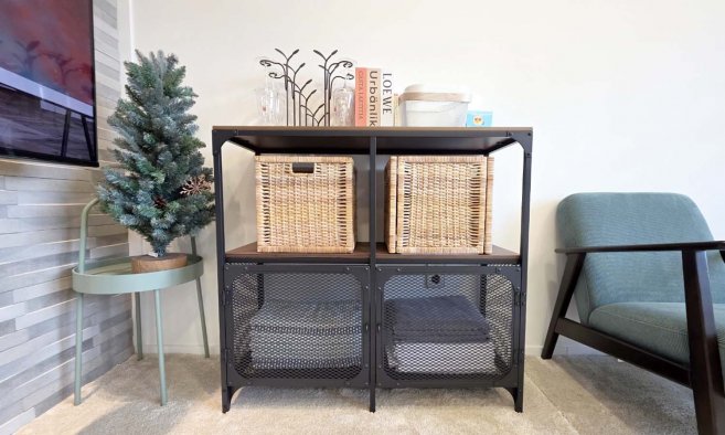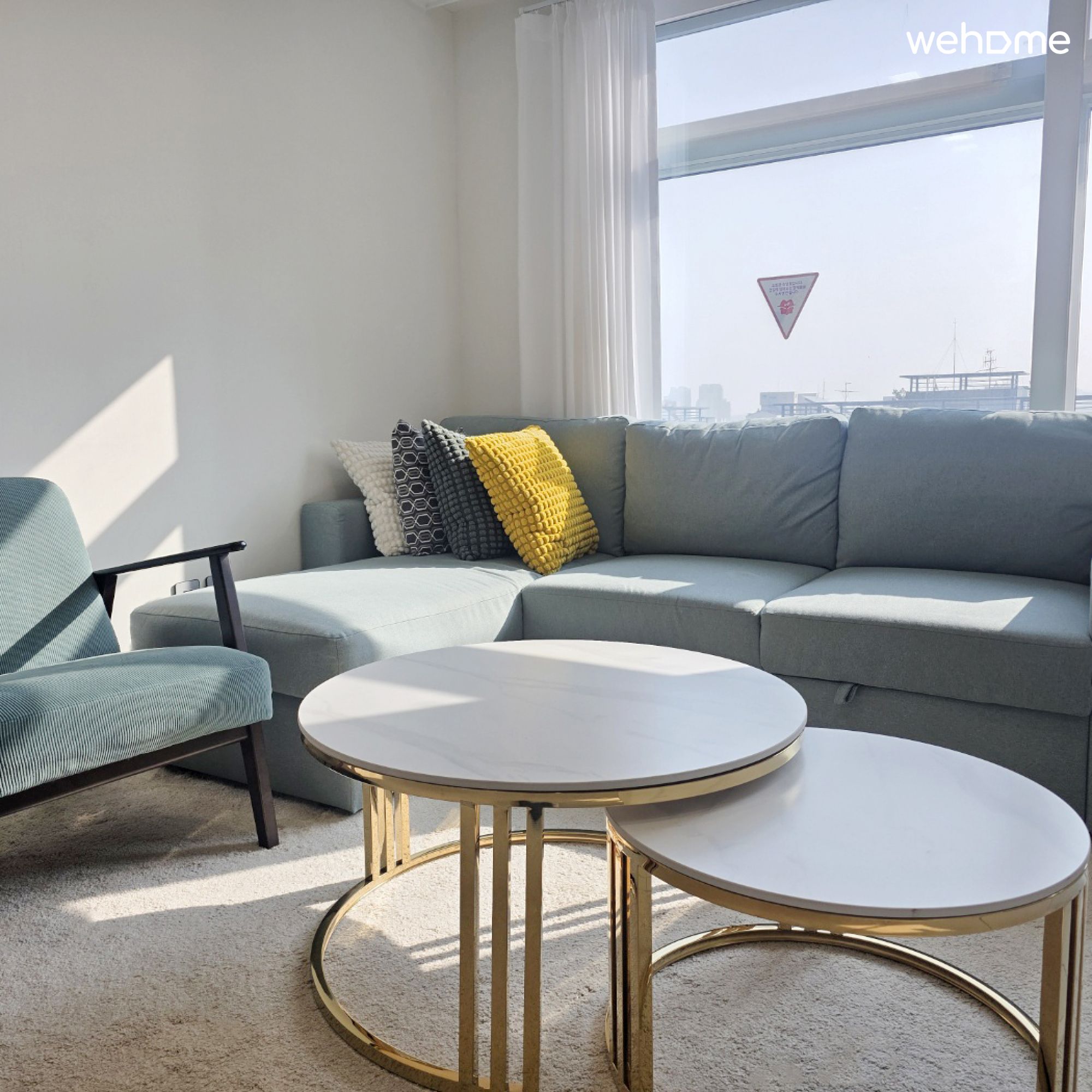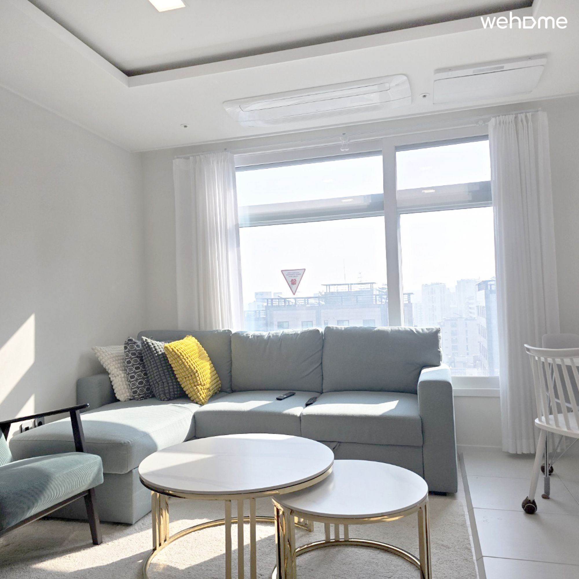 沙发床、扶手椅、65” 电视、空调、地毯、毯子
