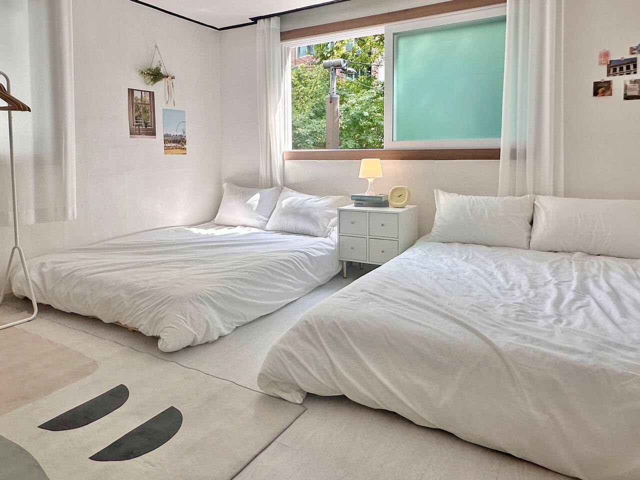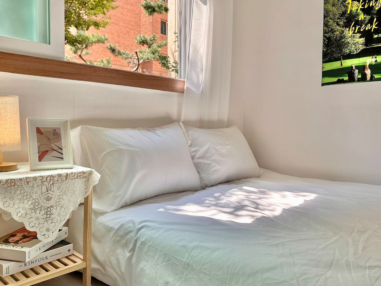 3张大床,最多7人,江南20分钟,新林站,机场巴士,弘大30分钟,2间卧室,客厅
